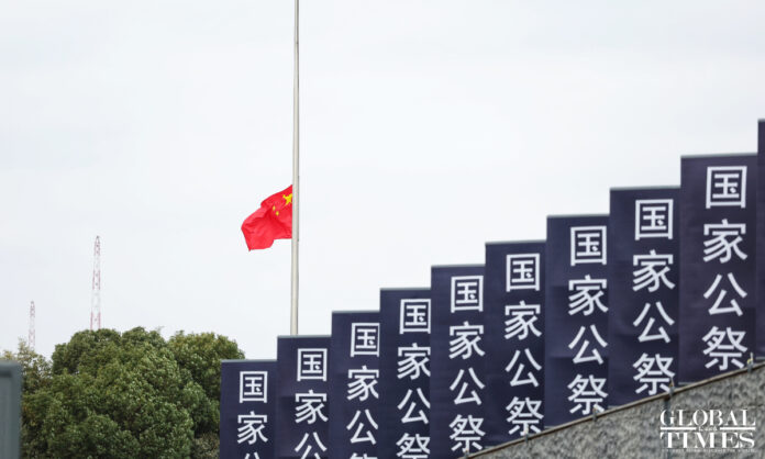 On the site, the Global Times reporters saw over 100 people, dressed in black, bowed before a monument surrounded by flowers.